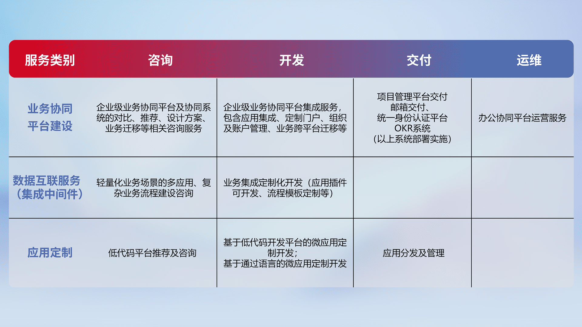 针对钉钉、、、企微、、、、IDaas等平台级产品提供产品的规划、、、方案、、、交付、、定制化开发等服务,,,,实现如统一协同办公、、智能客户服务、、、、混合会议管理、、、智能数据查询、、、等业务场景,,,实现数字化转型。。